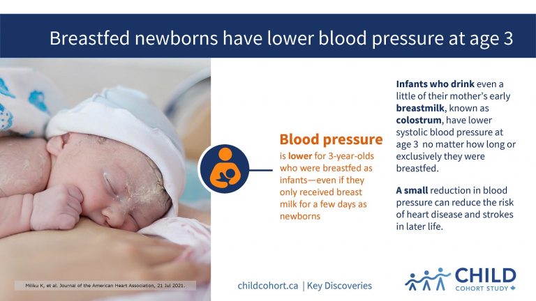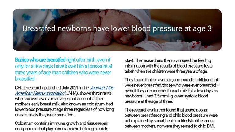 CHILD research, published July 2021 in the Journal of the American Heart Association (JAHA), shows that infants who received even a relatively small amount of their mother’s early breast milk, also known as colostrum, had lower blood pressure at age three, regardless of how long or exclusively they were breastfed.