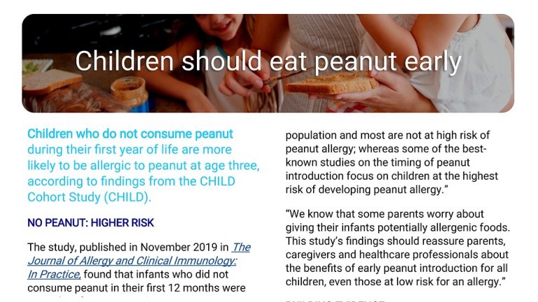 “We know that some parents worry about giving their infants potentially allergenic foods. This study’s findings should reassure parents, caregivers and healthcare professionals about the benefits of early peanut introduction for all children, even those at low risk for an allergy.”