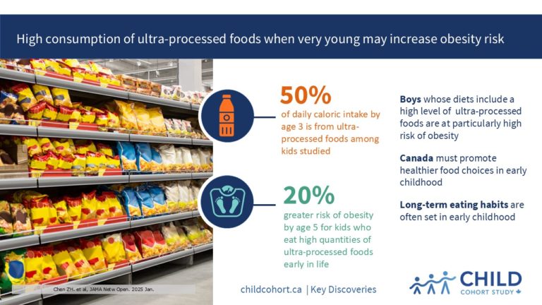 CHILD research has found that that ultra-processed food consumption among preschool Canadian children is alarmingly high. It also found this to be associated with greater risk of living with obesity or overweight, especially among boys.