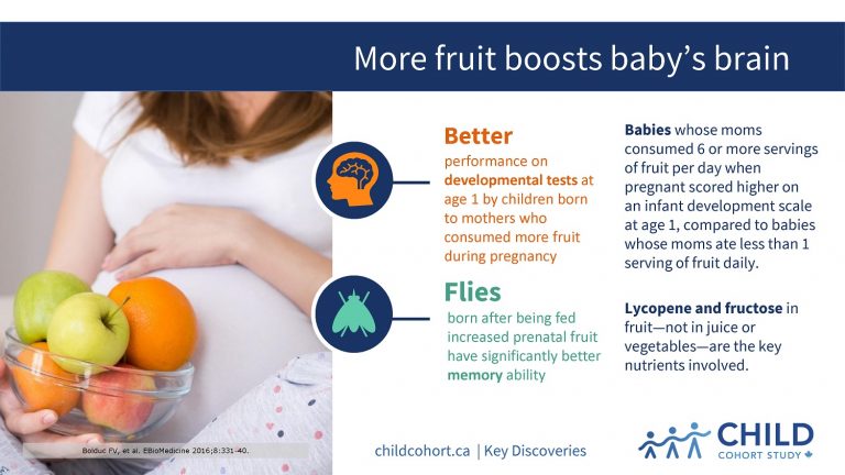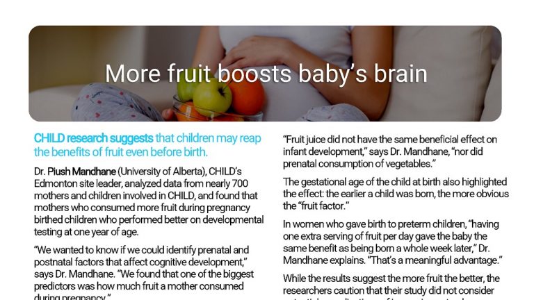 Dr. Piush Mandhane (University of Alberta), leader of CHILD’s Edmonton site, analyzed data from nearly 700 mothers and children involved in CHILD, and found that mothers who consumed more fruit during pregnancy gave birth to children who performed better on developmental testing at one year of age.