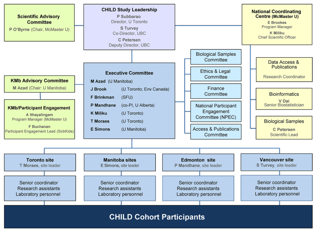 The Executive Committee comprises the Study Co-Directors, the site leaders and research theme leaders. It meets regularly, at the call of the Director. Among other things, the Executive Committee is responsible for determining how the primary CHILD Cohort Study is conducted, who is involved and how it is funded. Decision making is a shared responsibility of the Executive.