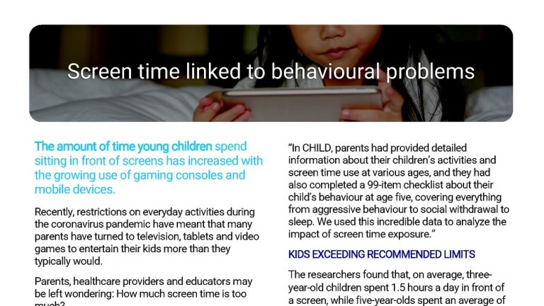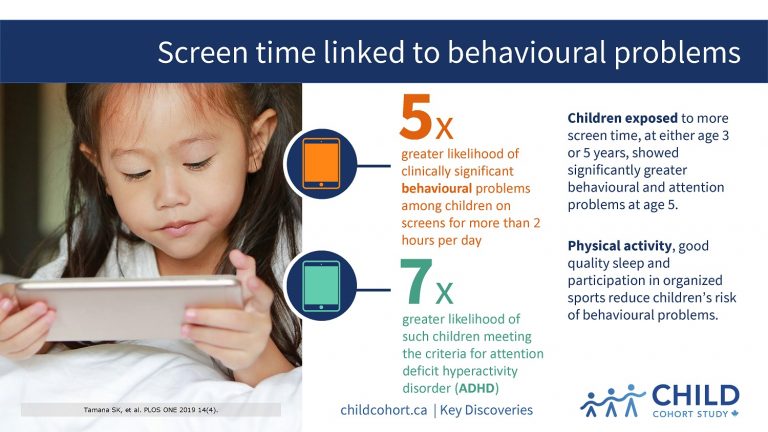 Using data from more than 2,400 CHILD participating families across Canada, Dr. Piush Mandhane (University of Alberta) and his team found that among preschoolers, two hours or more of screen time per day was linked to clinically significant behavioural problems.