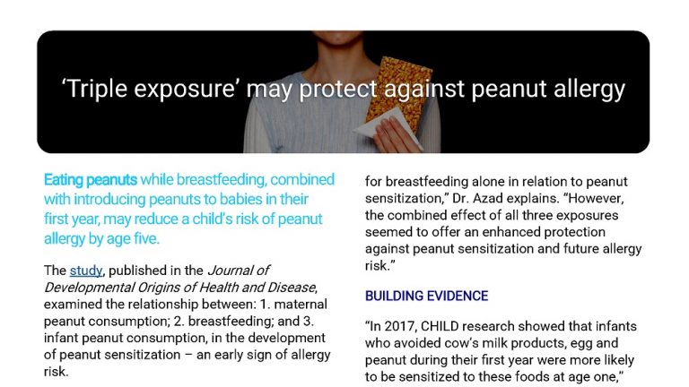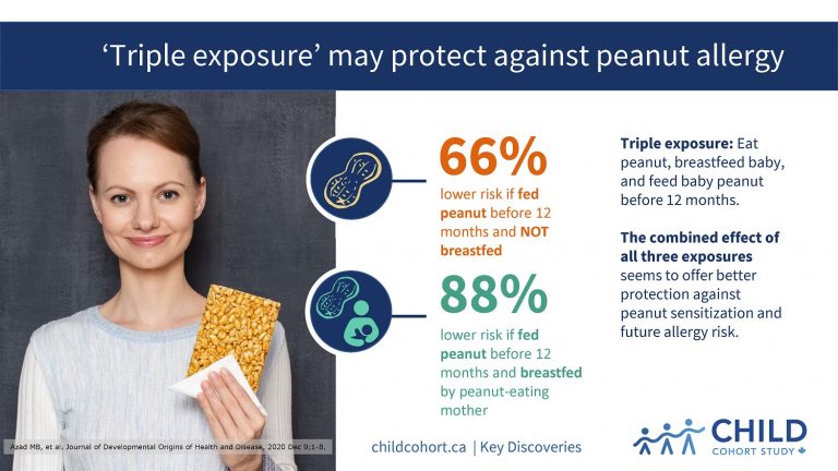 “In 2017, CHILD research showed that infants who avoided cow’s milk products, egg and peanut during their first year were more likely to be sensitized to these foods at age one,” says study co-author Dr. Malcolm Sears, founding Director of CHILD. In 2019, CHILD researchers published evidence that infants who did not consume peanut in their first 12 months were more than four times as likely to have a clinical peanut allergy by age three. “This new paper confirms the benefits of early introduction of these potentially allergenic foods,” adds Dr. Sears, “while contributing new evidence that maternal peanut consumption and breastfeeding could further enhance this protective effect.” “We hope that this research may also eventually contribute to the development of supplements or therapeutics for mothers who cannot safely consume peanut, and for infants who cannot be breastfed,” says Dr. Azad.